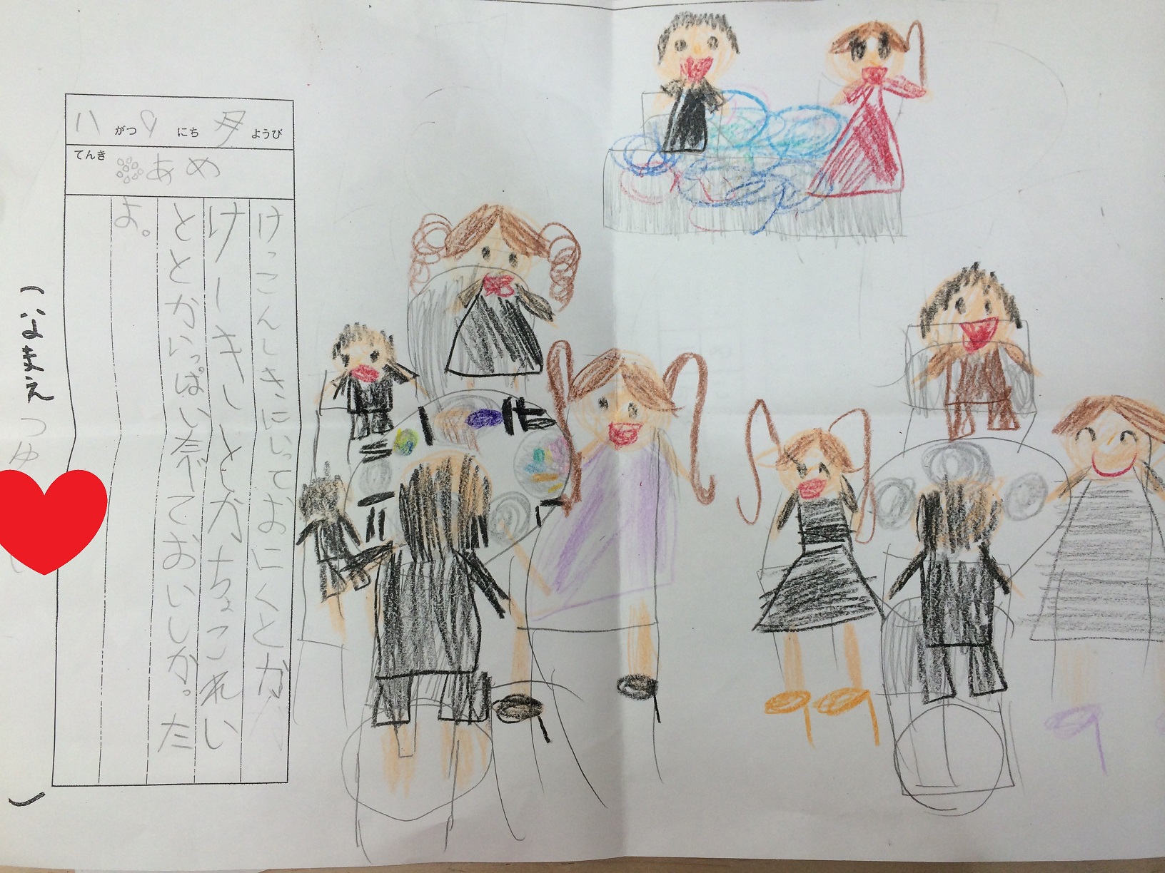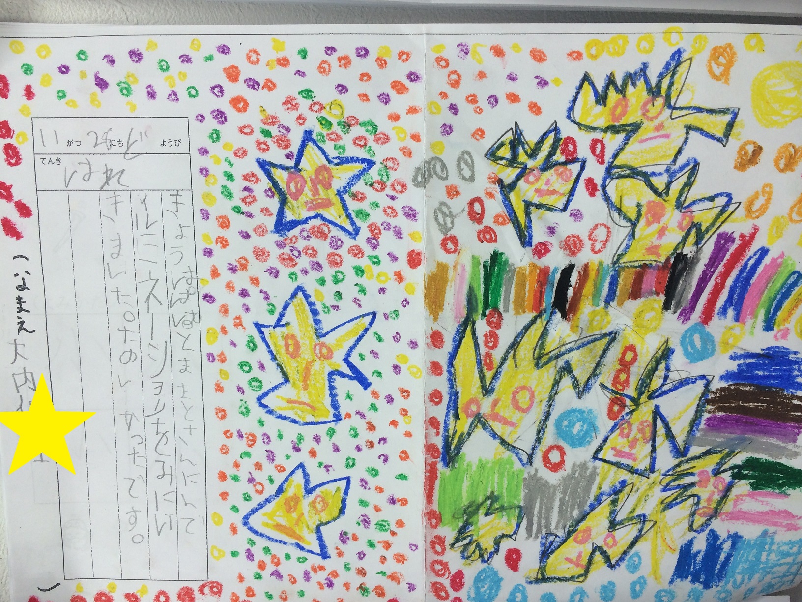 昨年も大変お世話になりました。 本年もスタッフ一同一生懸命がんばります。 さて、みなさまにご案内がございます。 静岡市葵区に新しく静岡葵教室がオープン致しました。 今まで富士教室に通って頂いておりました皆様、 大変長らくお待たせして申し訳ございませんでした。この場を借りて静岡葵教室をご案内させて頂きます。 受付 待合室 絵本は貸し出しを行っております。 トイレ お子様と一緒に入っても広く使えるようにしました。 なお、ホームページはリニューアルする予定で現在ホームページには静岡葵教室の情報がございません。 お問い合わせの方は下記電話番号までお問い合わせください。 静岡葵教室 住所:静岡市葵区馬場町37-1 電話番号:054-266-3766 *NHK静岡放送局の近くになります。 *建物の一階が駐車場となっておりますので自転車の方も、お車の方もお止頂けます。 年始通常レッスンは1月9日(火)からとなります。 説明会・無料体験レッスンご希望の方はお気軽にお電話ください。 キッズフォードアカデミー ayaka 新年明けましておめでとうございます。本年もよろしくお願いいたします。2016年は1月5日(火)よりレッスンが始まります。 お間違いのないようお願いいたします。 昨年は沢山の生徒たちの合格発表(静大付属・サレジオ・加藤学園)や作品の表彰など 嬉しいニュースが沢山ありました。 子供たちの作品を少しご案内させていただきます。 昨年の秋に防火ポスターで入選しました Aちゃんの作品がこちら↓ Aちゃんの作品の表彰は新聞にも載っていたようです。 見たかった~!! 他にも賞をとった!というお声を沢山頂いています。 頑張って見に行きます!! 時間がなくて見にいけなかった皆様、申し訳ありません(涙) つづいて年長さんの絵日記です。 Mちゃんの作品です。 結婚式に行ったときの日記ですね。文章を読まなくてもわかります!! すばらしい!!またこれを書くときに、ちゃんと大きさを考えながら 書いているようです。すごいですね!! こちらはHくんの作品です。 こちらはイルミネーションを見に行ったときの日記ですが 大きなイルミネーションを見にいったんですね。 ライトが元気よくかかれています。 男の子は女の子と比べると絵が上手に書けないと思われがちですが 子供たちは少し書く方法を教えてあげると 勝手に上達していきます。 学ぶ面白さを経験させてあげることがとても重要です。 特に負けず嫌いなお子さんは練習方法を教えて道具を置いておけば 見えないところで努力してくれます。 勝手にやり始めてくれるようになりますので 身近なところにクレヨンとスケッチブックは置いておきたいですね。 2016年はどんなニュースを聞かせてくれるのか楽しみです。 本年も講師一同、精一杯レッスンさせて頂きます。 ペーパーで問題を解くのではなく、具体物に触れ 経験を積みながら学ぶキッズフォードに 是非遊びに来てください。 ayaka 説明会、無料体験レッスンは お近くのお教室へお電話下さい。 6ヶ月から中学生までの幼児教室 キッズフォードアカデミー ホームページはこちら 生徒から手作りのお菓子を頂きました 白いマシュマロに顔が書いてあって かわいい~ 美味しく頂きました Sちゃん ありがとう この秋 沢山の生徒が幼稚園や小学校にお受験をしました 静岡大学付属 エンゼル幼稚園 加藤学園 幼稚園を受けられた方 小学校を受けられた方